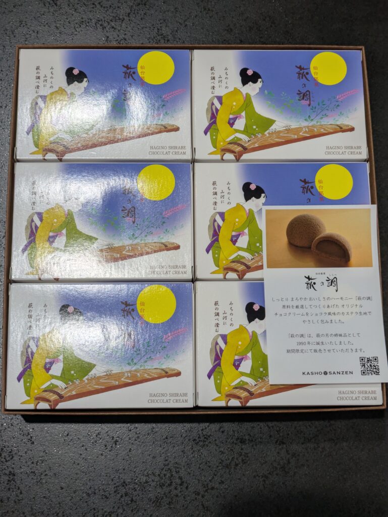 萩の調(しらべ)とは、仙台銘菓「萩の月」の姉妹品で、ショコラ風味のカステラ生地にチョコカスタードクリームを包んだチョコ味の期間限定商品です。