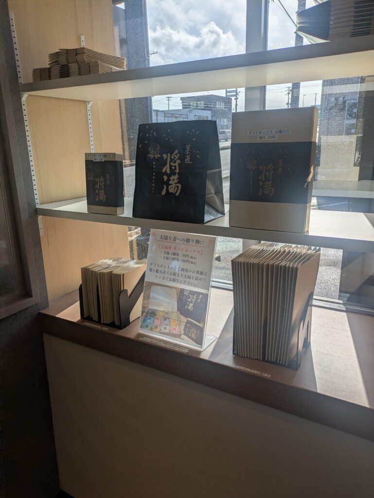 ギフトボックスを利用したい場合には、お店に入ってすぐの場所にギフトボックスが置いてあるので、箱を組み立てて購入する大福を中に詰めてレジに持っていけばOK!