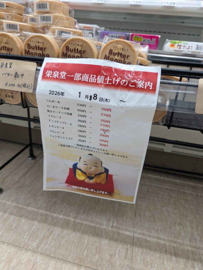 (赤字のものが値上げ後のお値段。10~30円ほどの値上げになりました。)